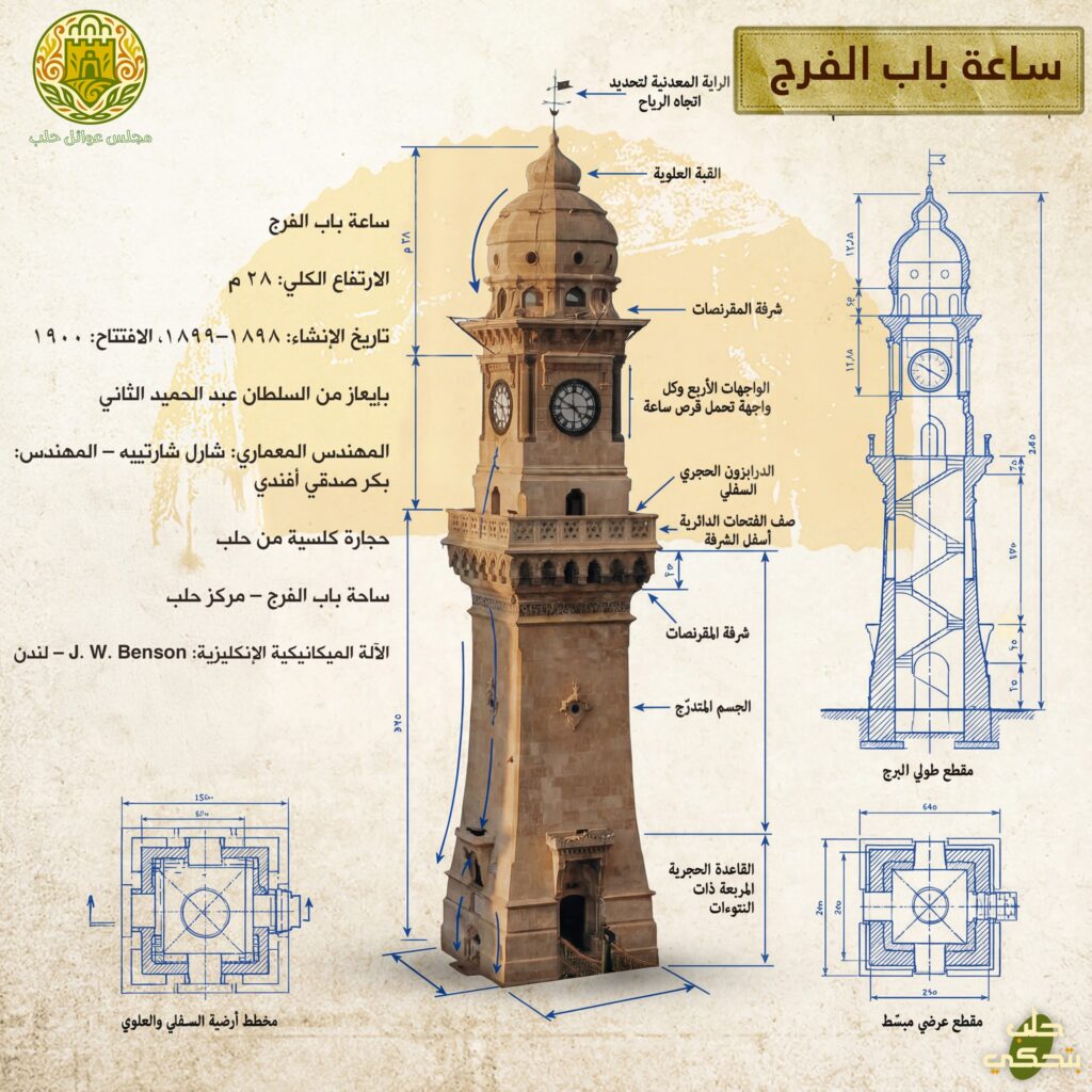 بُنِيتْ منارة أو برج ساعة حلب عام 1898 بالقرب من باب الفرج الذي تحمل اسمه، بإشراف المهندس النمساوي “شارتيه” الذي كان يعمل في بلدية حلب.